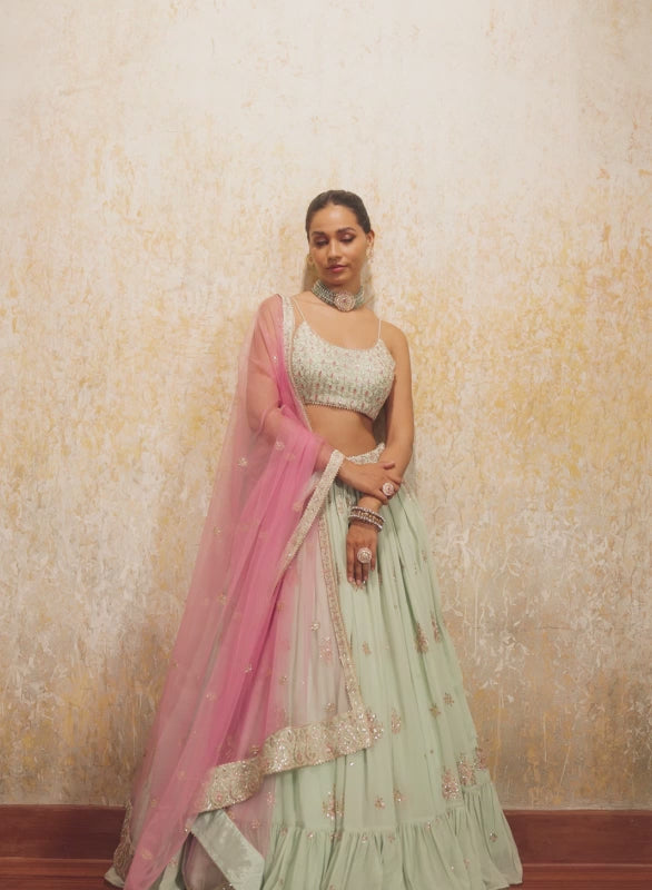 If you’re looking for a more subtle, dreamy green lehenga, the Green Embroidered Tissue Lehenga is your pick! The sublimely pastel shade of green fabric and artisanal detailing across the silhouette make it a dreamy statement for your daytime mehendi. This set includes a tissue top with a soft santoon inner lining, a matching tissue skirt also lined with santoon for a refined drape, and a delicate net dupatta, all made in India and hand-checked for quality, as with every piece from the collection.