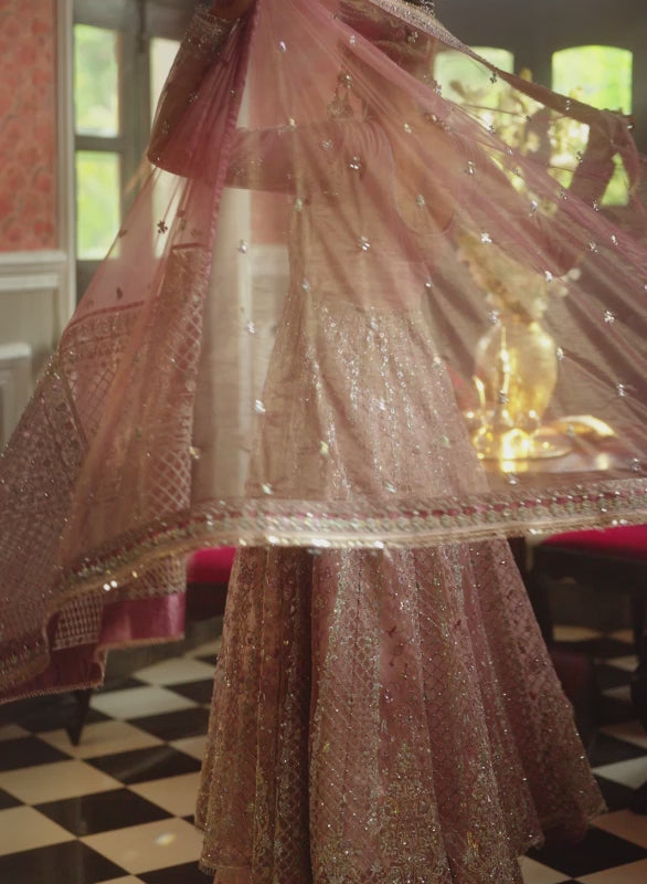 The coordinated dupatta, finished with refined detailing, frames the bride in soft sophistication, a gentle complement to joyous vows and cherished celebrations. Every element works in harmony to create a look that’s unforgettable yet effortlessly graceful.