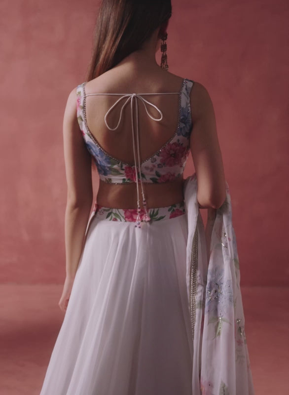 Woman in flowy white lehenga