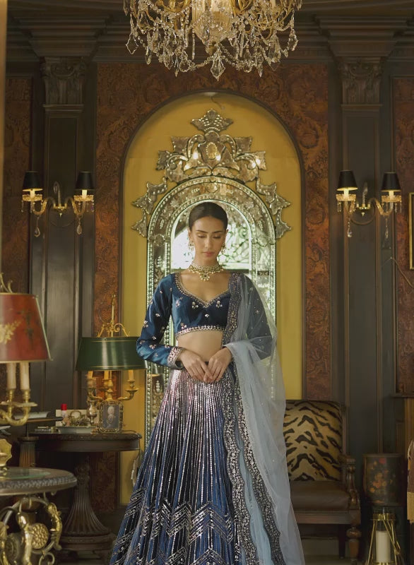 Similarly, the Blue Embroidered Brocade Lehenga channels calmness and divine strength, its color often associated with Lord Shiva himself.