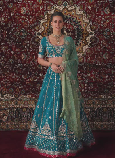 Teal Blue Embroidered Viscose Crepe Lehenga