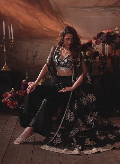 Our Black Embroidered Velvet Pant Set With Jacket includes a velvet top with satin inner, a velvet bottom, and a net jacket. Embroidery is present on this style using zari, thread, and sequins embellishments.