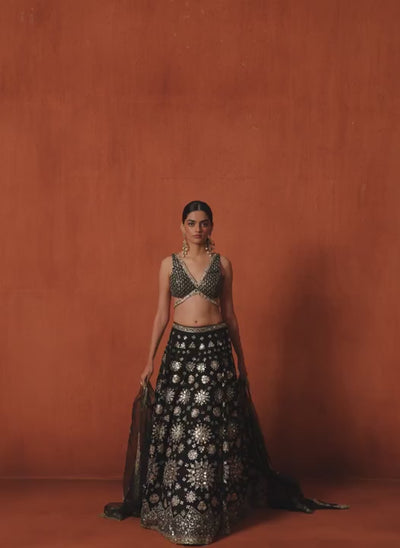Our Black Embroidered Velvet Satin Lehenga includes a velvet satin top with santoon inner, velvet satin bottom with santoon inner, and a net dupatta. Embroidery is present on this style using zari, sequins, and mirror work.