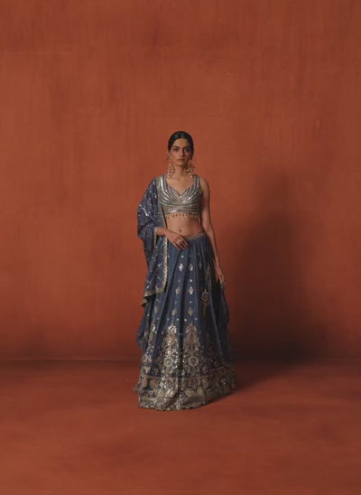 Our Blue Embroidered Chiffon Lehenga includes a chiffon top with santoon inner, chiffon bottom with santoon inner, and a chiffon dupatta. Embroidery is present on this style using zari, sequins, thread, and hand embellishments.