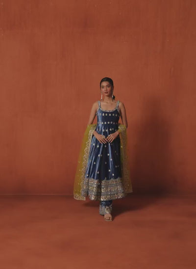 Our Blue Embroidered Velvet Anarkali includes a velvet top with santoon inner, velvet bottom with santoon inner, and a net dupatta. Embroidery is present on this style using zari, sequins, and thread work.