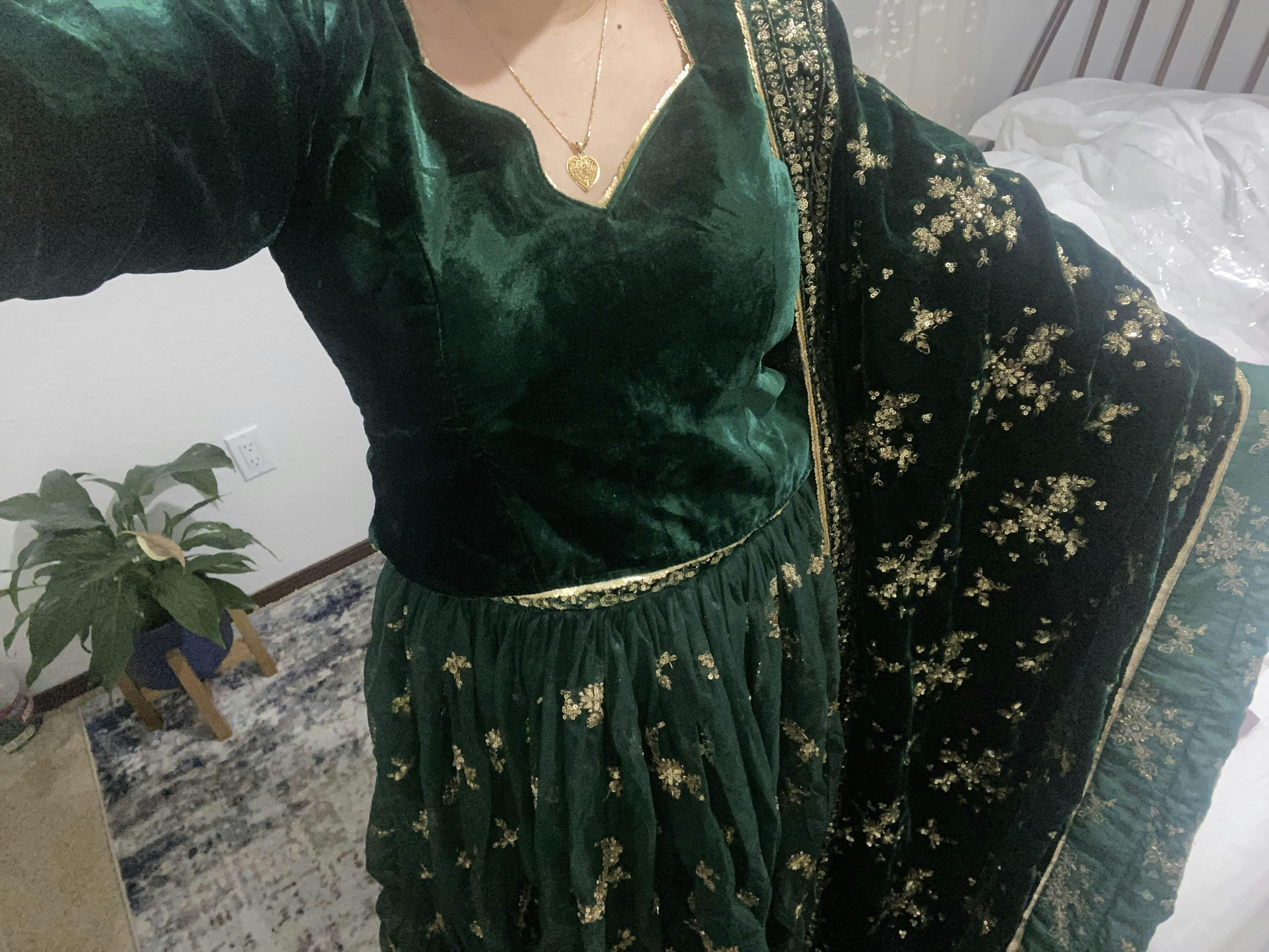 Dark Green and Gold Embroidered Velvet Lehenga