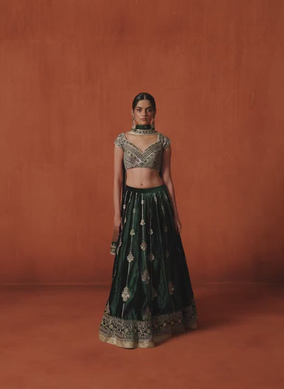 Dark Green Embroidered Velvet Lehenga