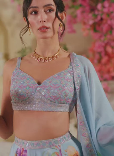Dusty Blue Floral Embroidered Satin Georgette Lehenga