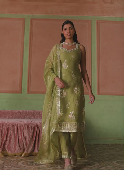 Our Dusty Green Embroidered Satin Straight Suit includes a satin top with crepe inner, a satin bottom with crepe inner, and a tissue dupatta. Embroidery is present on this style using zari, lace, and hand embellishments.