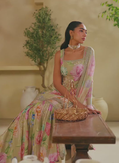 Dusty Green Floral Embroidered Crepe Silk Gharara Suit