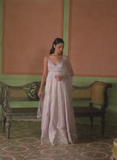 Our Dusty Mauve Embroidered Tissue Anarkali includes a tissue top with santoon inner, a tissue bottom with santoon inner, and a net dupatta. Embroidery is present on this style using zari, sequins, and beads work.