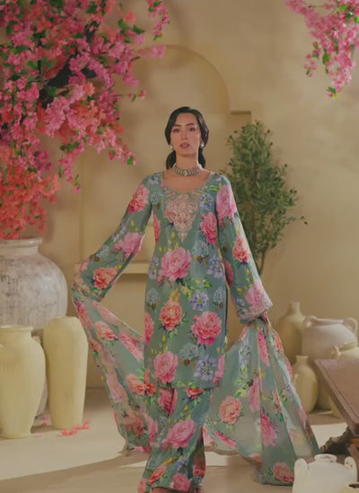 Dusty Mint Floral Embroidered Satin Georgette Palazzo Suit