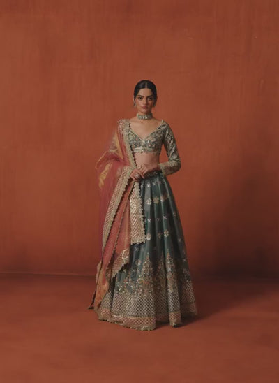 Dusty Teal Embroidered Silk Lehenga