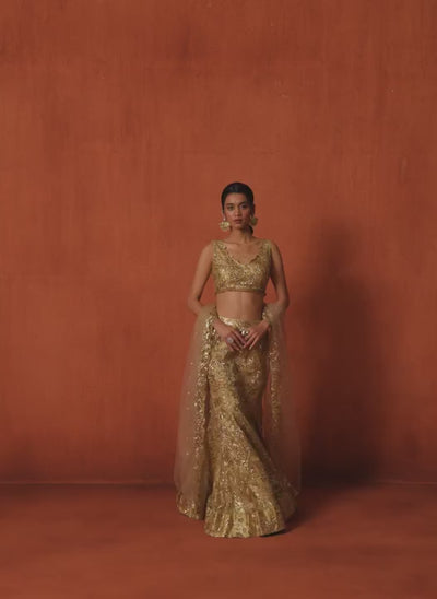 Our Gold Fishcut Embroidered Net Lehenga includes a net top with satin inner, net bottom with satin inner, and a net dupatta. Embroidery is present on this style using zari, sequins, thread, and beads work.