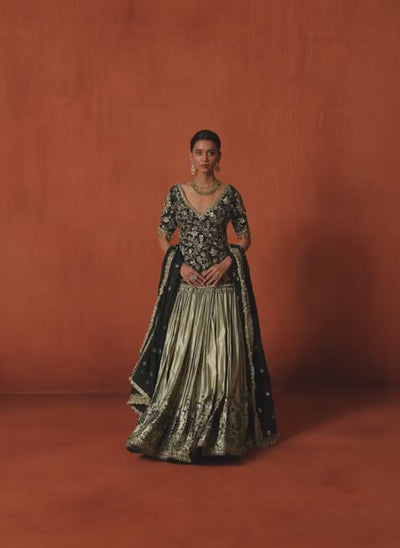 Our Green Embroidered Lampi Kurti Style Lehenga includes a lampi top with santoon inner, lampi bottom with santoon inner, and a silk dupatta. Embroidery is present on this style using zari, sequins, thread, mirror, and hand embellishments.