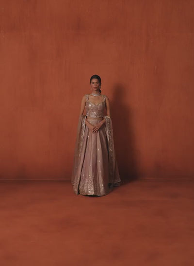 Our Light Mauve Embroidered Satin Lehenga includes a satin top with santoon inner, satin bottom with santoon inner, and a satin dupatta. Embroidery is present on this style using zari, sequins, thread, and beads work.