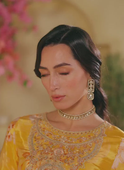 Our Marigold Yellow Floral Embroidered Crepe Silk Pant Suit includes a crepe silk top with crepe inner, a crepe silk bottom with crepe inner, and a chinon dupatta. Embroidery is present on this style using zari, sequins, and thread work.