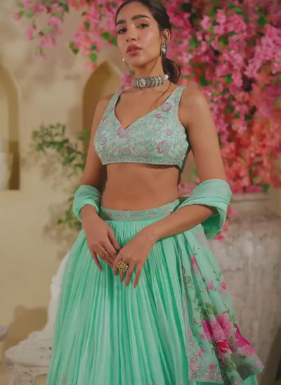 Our Mint Green Floral Embroidered Organza Lehenga includes an organza top with santoon inner, an organza bottom with santoon inner, and a net dupatta. Embroidery is present on this style using zari, sequins, and thread work.