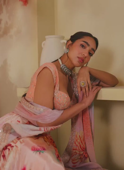 Our Multicolor Floral Embroidered Crepe Silk Lehenga includes a crepe silk top with santoon inner, a crepe silk bottom with santoon inner, and a chinon dupatta. Embroidery is present on this style using zari, sequins, and thread work.