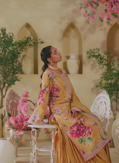 Mustard Floral Embroidered Satin Georgette Sharara Suit