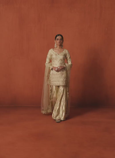 Our Off White Embroidered Brocade Gharara Suit includes a brocade top with santoon inner, lampi bottom with santoon inner, and a net dupatta. Embroidery is present on this style using zari, sequins, thread, and beads.