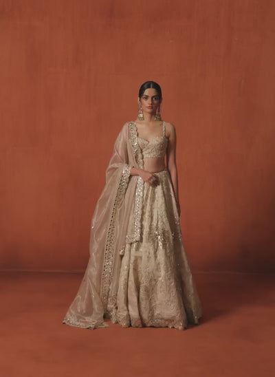 Our Off White Embroidered Silk Satin Lehenga includes a silk satin top with crepe inner, silk satin bottom with crepe inner, and a net dupatta. Embroidery is present on this style using thread, zari, sequins, beads, and mirror work.