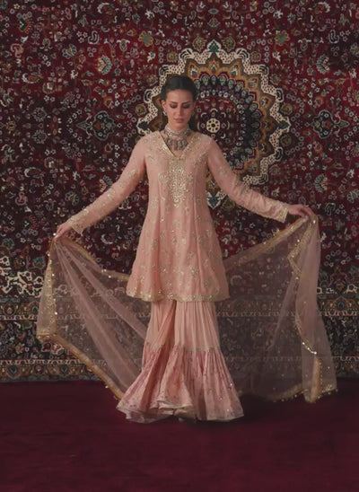 Our Peach Embroidered Satin Sharara Suit includes a satin top with santoon inner, tissue and silk bottom with santoon inner, and a net dupatta. Embroidery is present on this style using zari, sequins, and thread work.