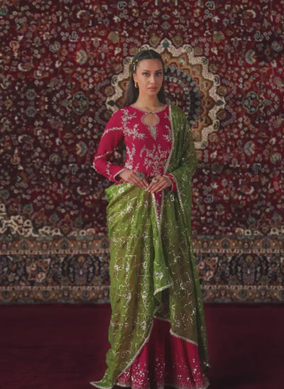 Pink and Mehendi Green Embroidered Viscose Crepe Sharara