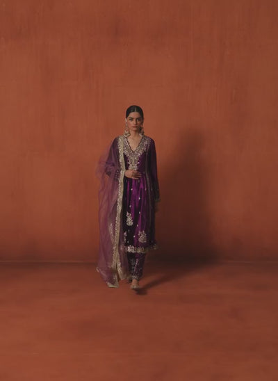 Purple Embroidered Velvet Straight Suit