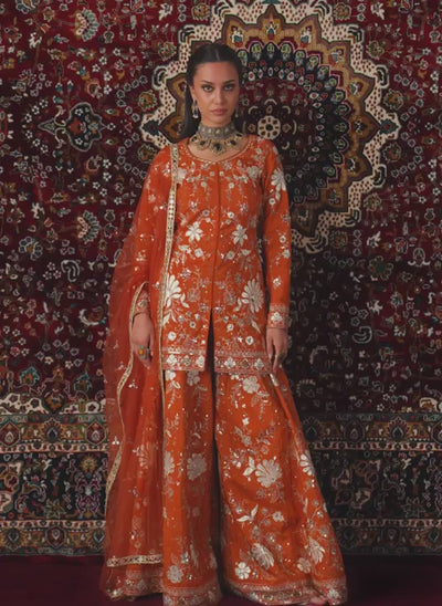 Our Rust Orange Embroidered Viscose Silk Sharara includes a viscose silk top with santoon inner, viscose silk bottom with santoon inner, and a net dupatta. Embroidery is present on this style using zari, sequins, and thread work.