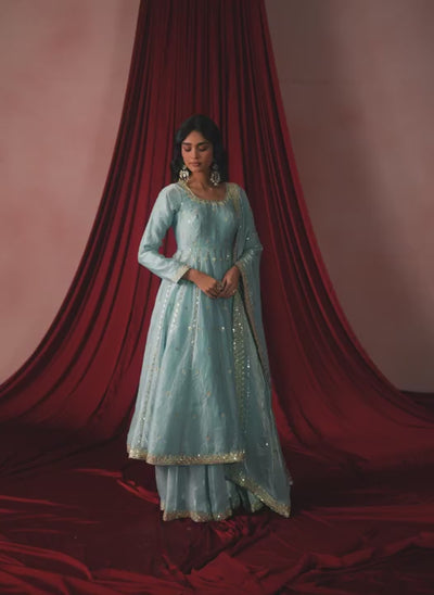 Our Sky Blue Embroidered Tissue Anarkali includes a tissue top with satin inner, tissue bottom with satin inner, and a tissue dupatta. Embroidery is present on this style using cording, sequins, and zari.