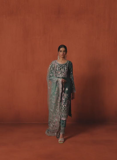 Our Teal Blue Embroidered Viscose Tissue Pant Suit includes a viscose tissue top with crepe inner, viscose tissue bottom with crepe inner, and a viscose tissue dupatta. Embroidery is present on this style using zari, sequins, thread, and hand embellishments.